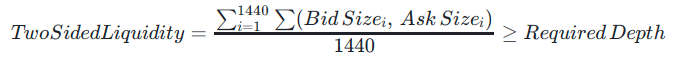 Aylık Emir Derinliği: Aylık Emir Derinliği = Günlük Emir Derinliklerinin ortalaması. Sonuç, iki yönlü minimum derinlikten büyük olmalıdır; aksi takdirde Market Maker standardı karşılanmış sayılmaz.