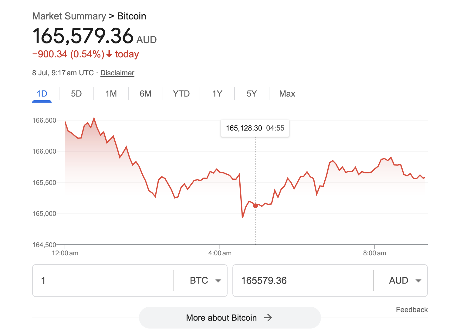Chart: BTC/AUD intraday price (Source: Google Finance, July 8, 2025)