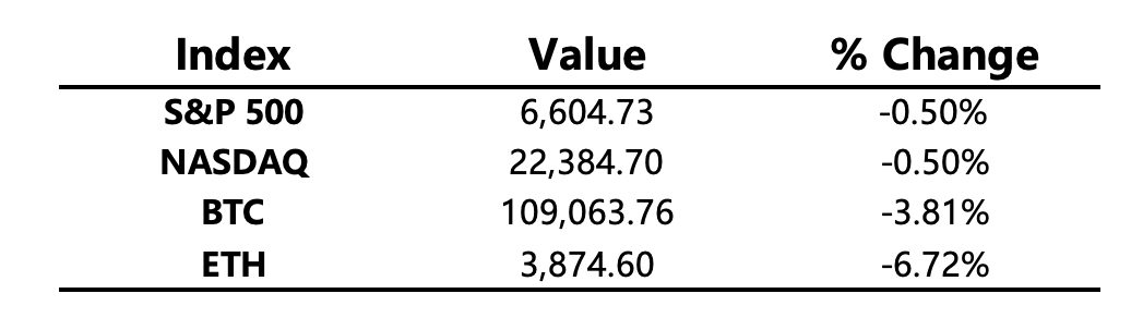 Macroeconomic Environment: Economic data showed strong Q2 GDP and a rebound in inflation, dampening expectations for rate cuts. Meanwhile, escalating geopolitical conflicts have intensified market concerns, compounded by previous worries over high U.S. stock valuations. Market sentiment is weak, with the three major U.S. stock indexes falling for three consecutive sessions—the longest streak in a month—wiping out gains made after the Fed’s September meeting. After-hours, Trump announced new tariffs, putting additional pressure on U.S. stock futures.