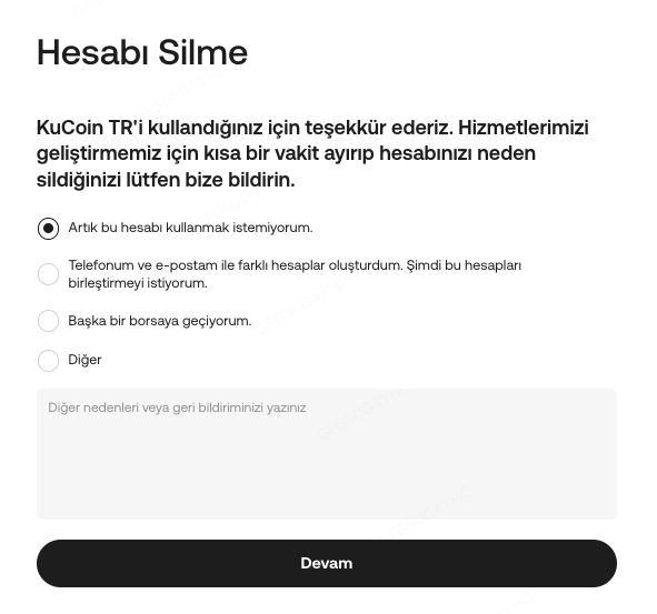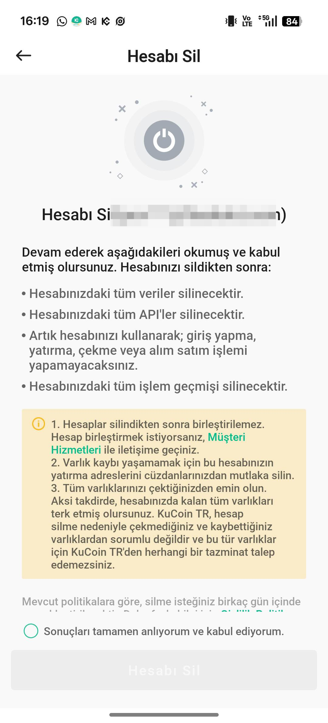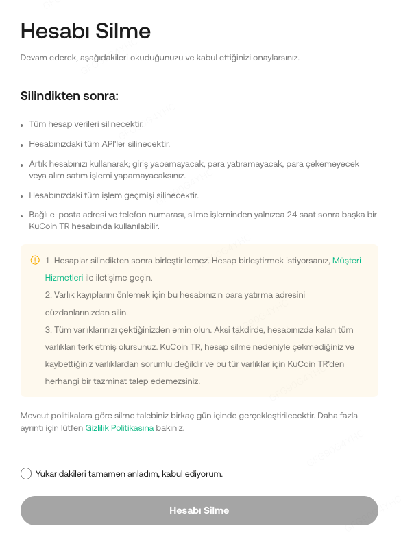 If you would like further information on disabling or deleting your KuCoin account, please reach out to the KuCoin TR Support https://www.kucoin.tr/en/support