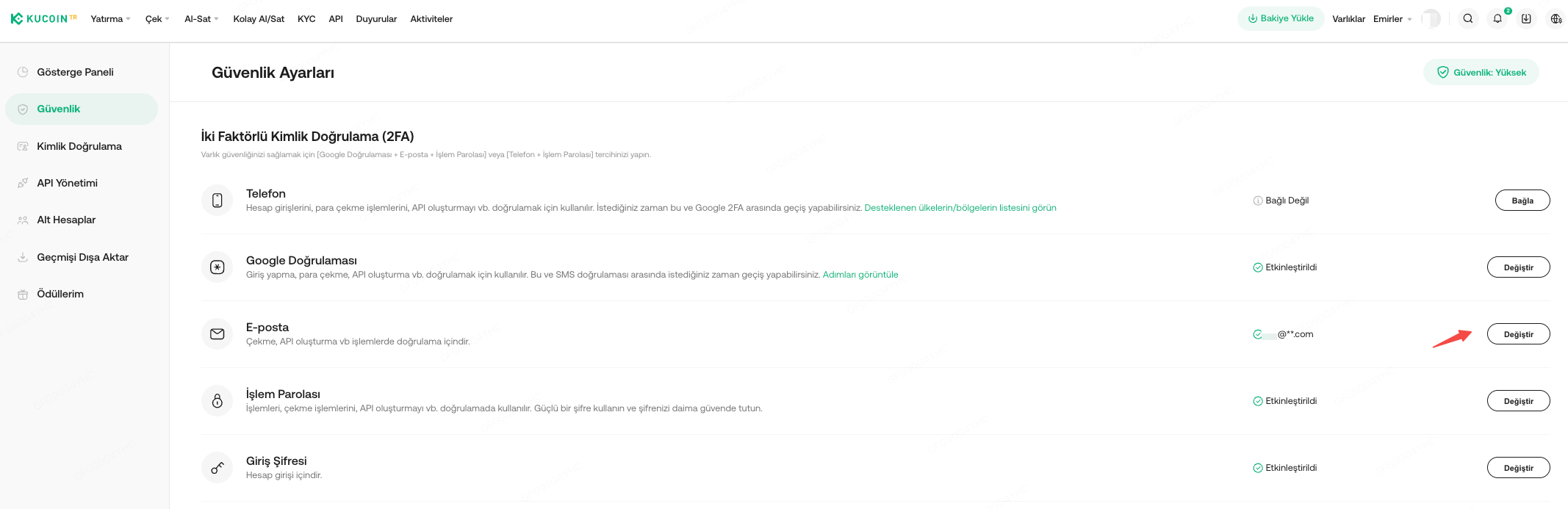 Step 1: After logging in to your KuCoin TR account, hover over your profile on the top-right corner and click on 'Account Security'. Then, locate Email and click Change.