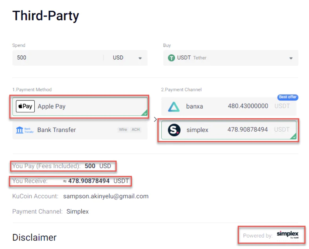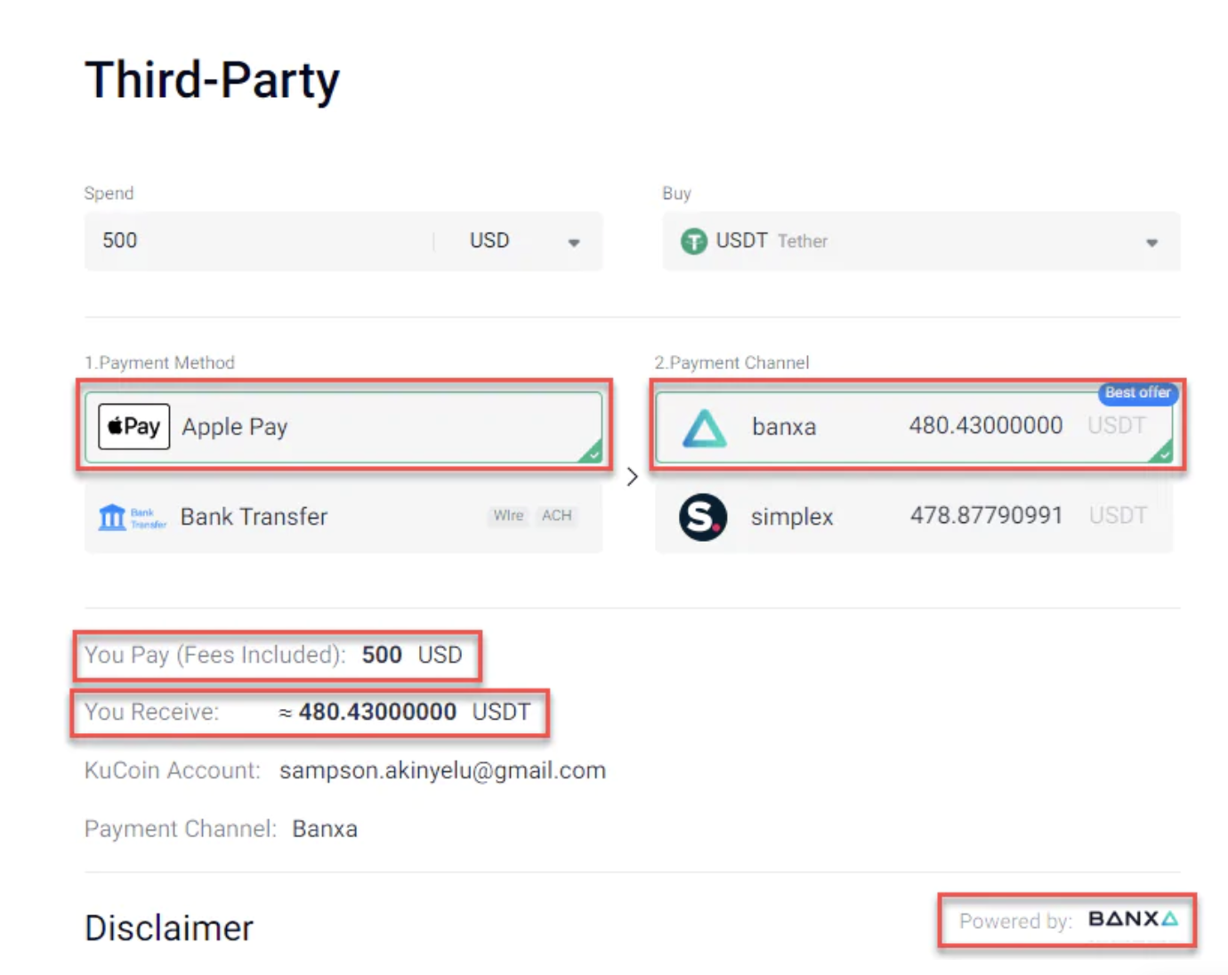 Apple Pay kullanarak iki farklı işlemci (Banxa vs. Simplex) üzerinden bir örneğe bakalım: 500 USD harcama ile USDT satın alma .