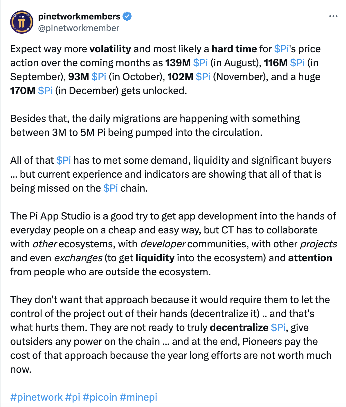 **Şeffaf İletişim:** Pi Ağı çekirdek ekibi, token açma takvimi, arzı yönetme stratejileri ve merkeziyetsizlik ile fayda sağlama konusundaki ilerlemeler hakkında toplulukla iletişimini geliştirmelidir. Açık, proaktif ve şeffaf iletişim, topluluğun endişesini hafifletmeye ve ortak bir amaç duygusu oluşturmaya yardımcı olabilir.