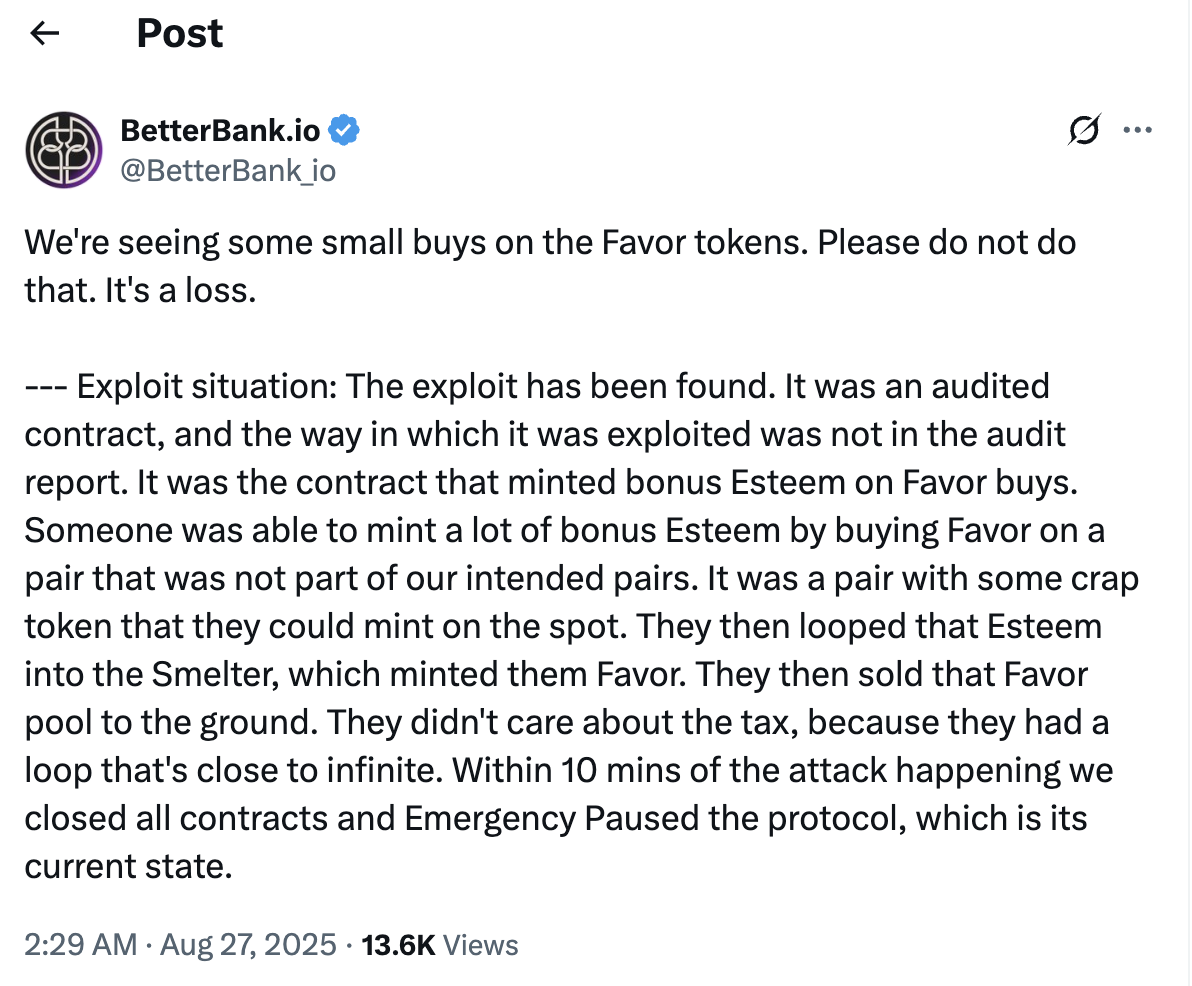 Web3 alanı hızlı gelişimini sürdürürken, güvenlik açıkları endüstri için sürekli bir tehdit olmaya devam ediyor. BlockBeats tarafından hazırlanan bir rapora göre, PulseChain ağı üzerinde faaliyet gösteren BetterBank adlı Merkeziyetsiz Finans(DeFi) platformu, kötü niyetli bir saldırıya uğrayarak yaklaşık5 milyon dolar değerinde ciddi bir varlık kaybı yaşadı. .