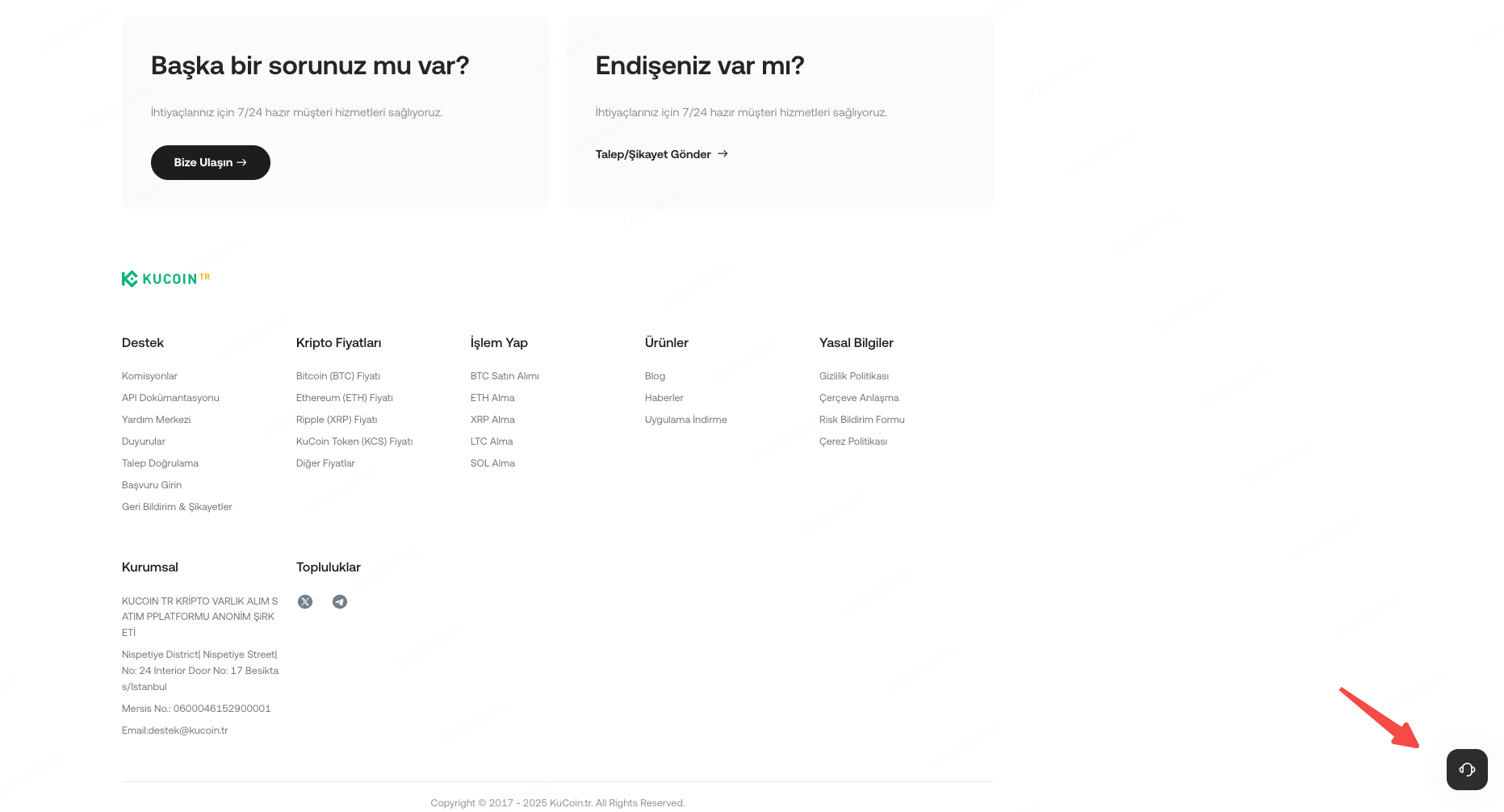 KuCoin TR resmi web sitesini açın. Ana sayfanın altındaki Hizmetler bölümünden Yardım Merkezi'ni seçin. Alternatif olarak, sağ alt köşedeki “Yardıma mı ihtiyacınız var?” müşteri destek simgesine tıklayın.