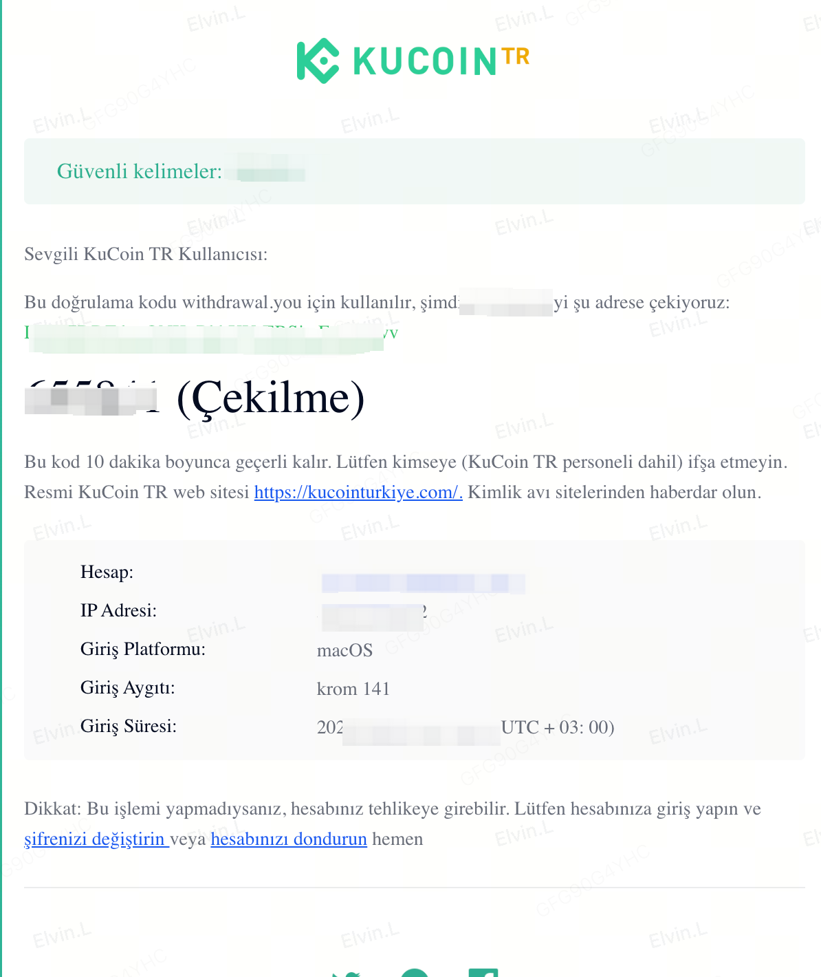 1.1 Hassas işlemleri gerçekleştirirken, onay e-postası alırsınız ve bu e-postada bir dondurma bağlantısı bulunur. Bağlantıya tıklayarak hesabınızı anında dondurabilirsiniz. Bu onay e-postasını tetikleyen senaryolar şunları içerir: