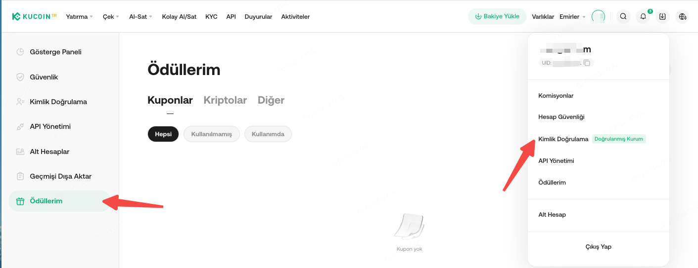Ödüllerim, KuCoin TR platformundaki merkezi bir portal olup, promosyonlar, kampanyalar, işlem bonusları veya yönlendirmeler yoluyla alınan kuponlarınızı ve ödüllerinizi görüntüleyebileceğiniz, yönetebileceğiniz ve kullanabileceğiniz bir alandır. Bu özellik, avantajlarınızı talep etmeyi ve kullanmayı asla kaçırmamanızı sağlar.